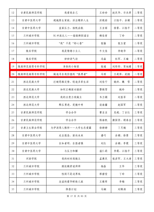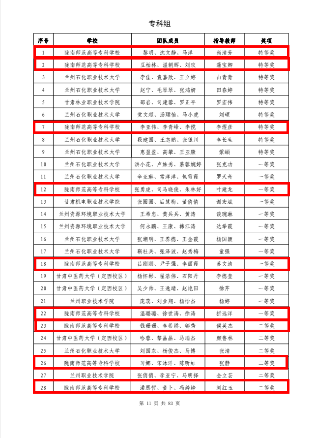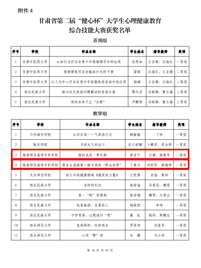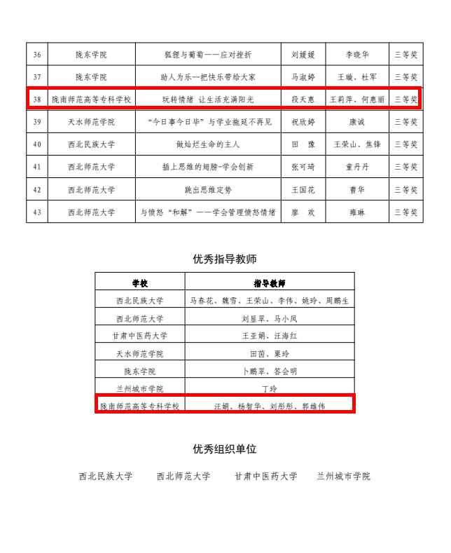汪娟、杨智华、刘彤彤、郭雄伟荣获优秀指导教师称号。黎明、沈文静、马洋(指导教师:尚清芳),豆柏林、温朝辉、刘玟(指导教师蒲宝卿),李亚伟、李青峰、李傥(指导教师:李煜彦)3组荣获全国大学生数学建模竞赛(甘肃赛区)专科组特等奖;张勇虎、司马晓俊、朱林妤(指导教师:叶建龙),吕刚刚、尹子强、李丽霞(指导教师:苏文清),温璐璐、徐世涛、徐涛(指导教师:折远洋)3组荣获一等奖;钱珊珊、李希娇、郇秀(指导教师:侯英杰)等6组荣获二等奖。郭亚宁(指导教师:汪娟、杨智华),丁泰兴(指导教师:刘彤彤、郭雄伟)2组荣获甘肃省第二届“健心杯”大学生心理健康教育综合技能大赛教学组一等奖;张瑞(指导教师:刘彤彤、贺旭增),马雨(指导教师:马莉萍、武燚)2组荣获二等奖;段天惠(指导教师:马莉萍、何惠丽)荣获三等奖。郭香(指导教师:曹宏伟、刘凤英)荣获甘肃省大学生朗诵大赛三等奖。