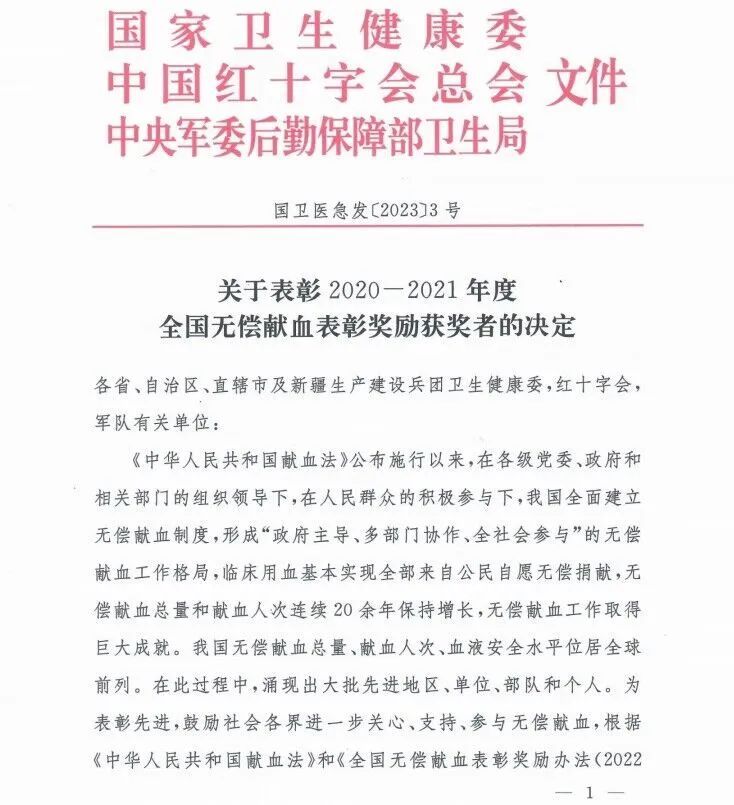 近日,国家卫生健康委、中国红十字会总会、中央军委后勤保障部卫生局下发《关于表彰2020-2021年度全国无偿献血表彰奖励获奖者的决定》,对全国2020—2021年度在无偿献血工作中做出突出成绩的省(市)、单位和个人进行表彰。在本次表彰中,米兰官网喜获“2020-2021年度全国无偿献血促进奖(特别奖)”荣誉称号。