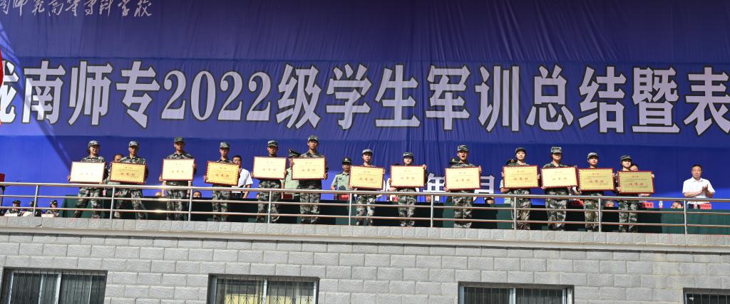 与会领导为军训工作中表现突出的10名优秀教官、3个优秀连队、4名优秀连长、13名优秀指导员、18个优秀排、8名先进工作者、204名优秀军训学员表彰颁奖。