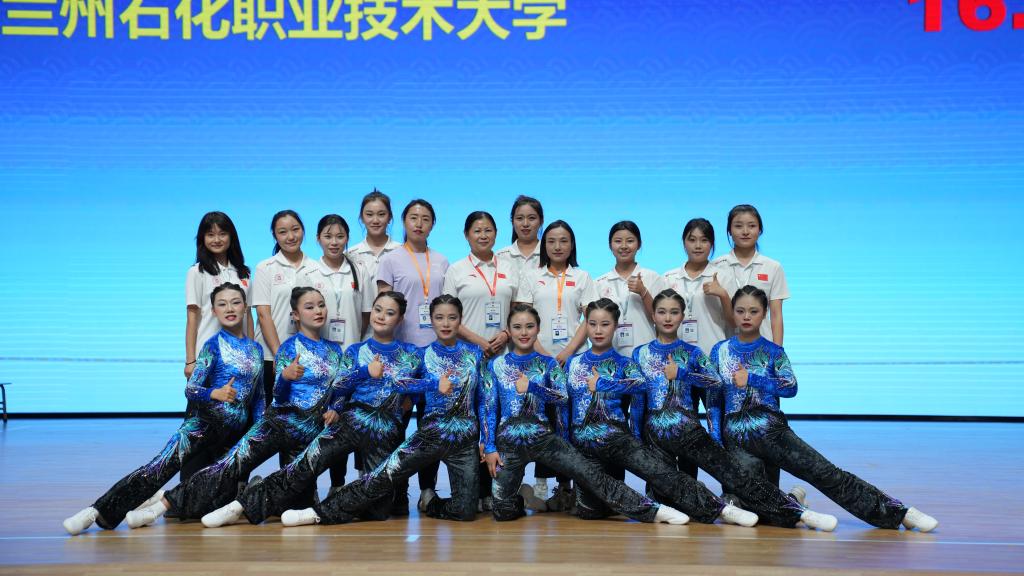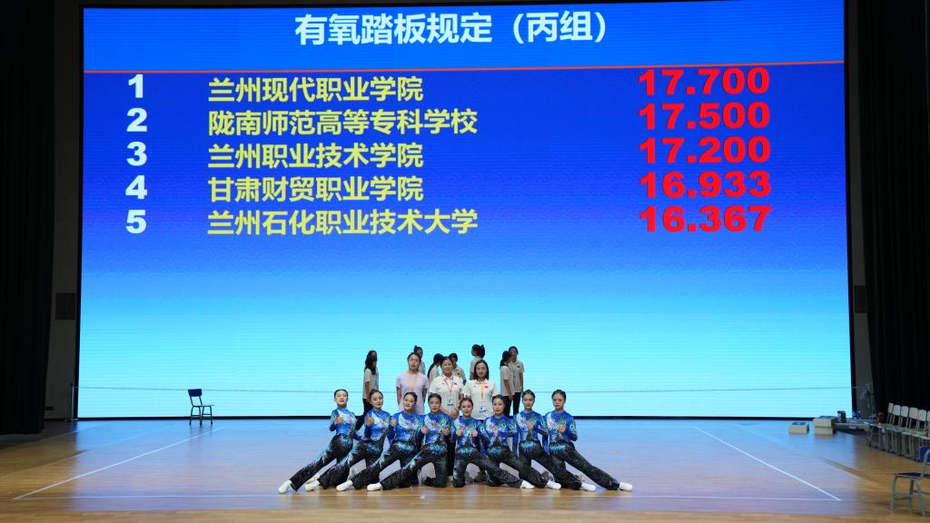教练员陈佳、张吴霞指导参赛的丙组规定踏板操项目,从选拔队员到比赛历时共三个多月,由初等教育学院周雅以及学前教育学院王亚琴、杨媛媛、阴芳、赵锦妍、马君薇、徐含蓉、马佳瑶等8人组成,队员们备赛时齐心协力,信心饱满,在赛前顶住压力,赛中超越自我,最终荣获甘肃省第五届大学生运动会丙组规定踏板第二名的优异成绩!