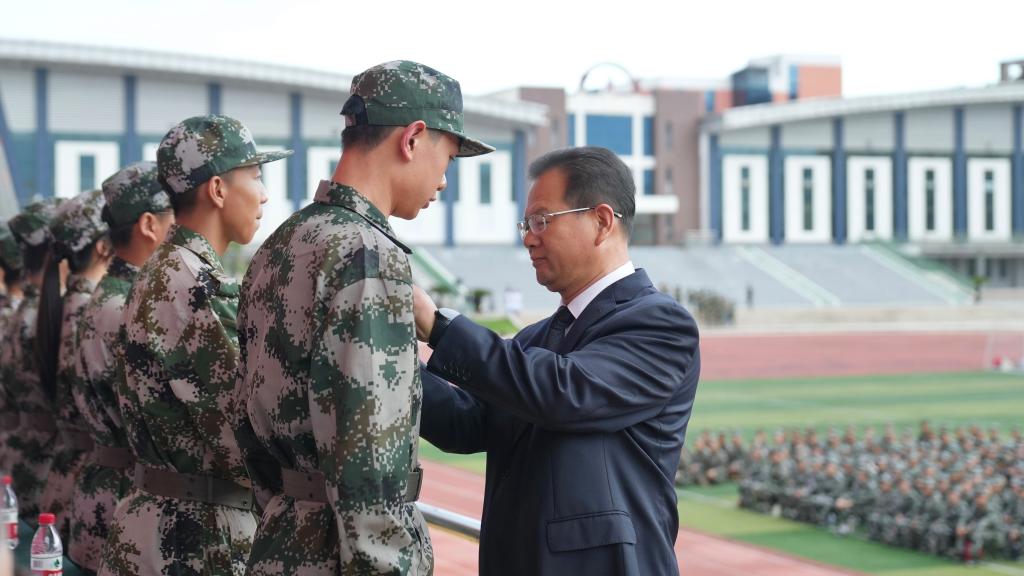 向君为2025级新生授军训团团旗,校领导为10个连授连旗。