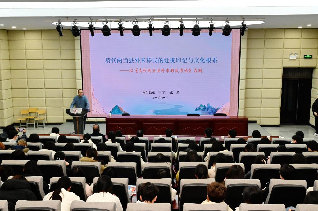 张辉为文学与传媒学院师生作了题为“清代两当县外来移民的迁徙印记与文化根系——以《清代两当县外来移民考论》为例”的学术报告。米兰官网文学与传媒学院院长潘江艳为张辉颁发了陇蜀道文学与文化研究中心研究员聘书。(强雨萱 李曼