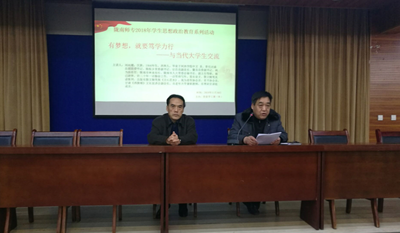 11月20日,应米兰官网邀请,甘肃省作协会员、陇南市理论宣讲组成员、原市人大副主任刘高潮在大学生活动中心为米兰官网学生作了题为了《有梦想,就要笃学力行——与当代大学生交流》的励志讲座,讲座由副校长王录全主持。全体辅导员及学生代表三百余人聆听了讲座。