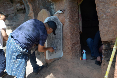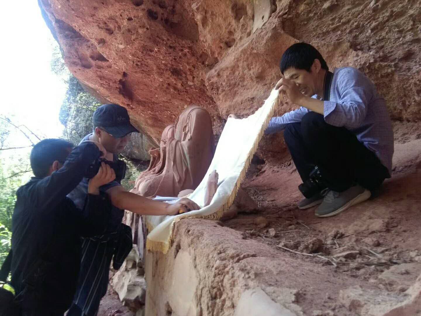 考察前,团队做了明确的考察分工。团队成员、中心特聘研究员、科研外事处处长蒲向明教授负责人文地理、传说故事、文化传承等方面的调查;团队成员、中心秘书长、校史馆馆长刘吉平教授负责通联、图像资料搜集、配合领队做好实物考察;中心研究人员、美术与设计学院豆海红副教授负责摄影、配合领队做好测量、记录等工作。在为期一天的考察中,团队重点考察了位于柳林镇磨沟村北300米丹霞崖壁的真空寺石窟,对遗存的5个摩崖浅龛、1个平面方形石窟及古代泥塑彩绘佛像残存进行了细致的测量、拍照,并对寺内明、清时期的碑刻进行了拓印和辨识。经过访谈获得了《真空寺的来历》、《三姊妹的传说》、《独臂将军余秋里隐蔽真空寺养伤传说》等有关民间文学素材,记录了在附近一带相近地貌现存多数佛道寺院遗迹的人文地理及文化环境情况,对民间相关技艺传承做了大致了解。团队还顺道考察了县级文保单位甘沟古文化遗址和展览馆,对今存考古遗址进行了细致观察、拍照和定位测量,对出土的文物——新石器时代晚期齐家文化类型石器及陶质鬲、豆、罐、盆等进行观察、记录和拍照。经访谈所知,甘沟遗址发现后,考古部门又在柳林境内发现了十三处遗址,其中位于柳林村东永宁河北岸的第二级台地上的柳林遗址属大地湾一期文化及仰韶文化遗存,距今已有7000至8000年历史,是徽县目前新石器时代最早的遗址。最后,团队还考察了柳林镇圣泉寺及其木雕、青阳山(寺)及寺内收藏的古代石雕佛像及其它文物,对徽县道教协会主席张志德道长进行了采访,并采集了有关文物、遗存的图片资料测量数据。