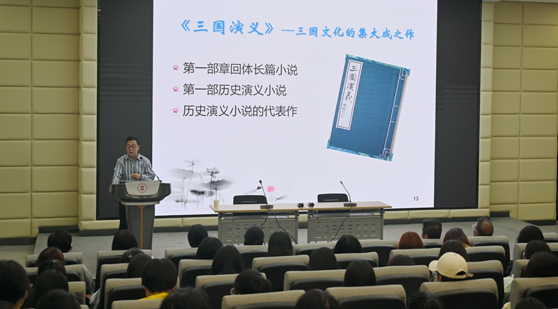报告会上,雷勇教授首先分析了当下“三国热”现象中产生的不同的文化见解。他指出,对于任何一部文学作品和任何一种文化现象都应该站在辩证的立场去思考、学习,这样才能取其精华、去其糟粕、发扬传统、推陈出新。接着,他从三国文化与“三国热”、三国之主的成功之道、关公崇拜与忠义精神以及诸葛亮精神与当代核心价值观的构建等四个方面进行了阐述。他指出,诸葛亮是中华民族传统美德最完美的体现者,是中国知识分子理想人格的典范,是中华民族自强不息精神的典型代表,并阐释了诸葛亮精神对当代的意义。他希望大家不但要从《三国演义》中汲取成功的经验,而且要看到一些失败的人物和教训,还要取其精华、去其糟粕,这样才能有所作为。