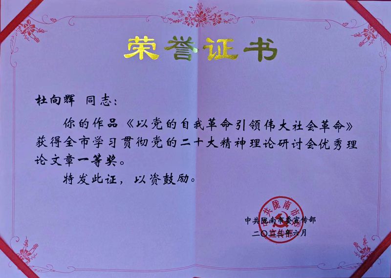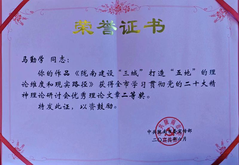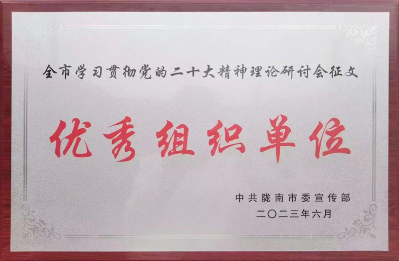 6月27日,陇南市学习贯彻党的二十大精神理论研讨会在宕昌县哈达铺红军长征纪念馆召开。陇南市人民检察院检察长周元、陇南市委宣传部常务副部长管文魁、宕昌县委副书记张小虎出席会议,市委讲师团团长陈霞主持会议。市社科联副主席杜永鹏宣读表扬通报。米兰官网马克思主义学院副院长杜向辉《以党的自我革命引领伟大社会革命》荣获全市学习贯彻党的二十大精神理论研讨会优秀理论文章一等奖,院长马勤学、教师高志辉《陇南建设“三城”打造“五地”的理论维度和现实路径》《全过程人民民主的科学内涵、价值意涵及实践路径》荣获全市学习贯彻党的二十大精神理论研讨会优秀理论文章二等奖,米兰官网获全市学习贯彻党的二十大精神理论研讨会征文“优秀组织单位”荣誉称号。