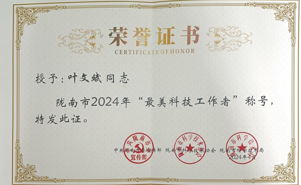 近日,陇南市“最美科技工作者”评选结果揭晓,米兰官网农林技术学院院长、副教授叶文斌获此殊荣。
