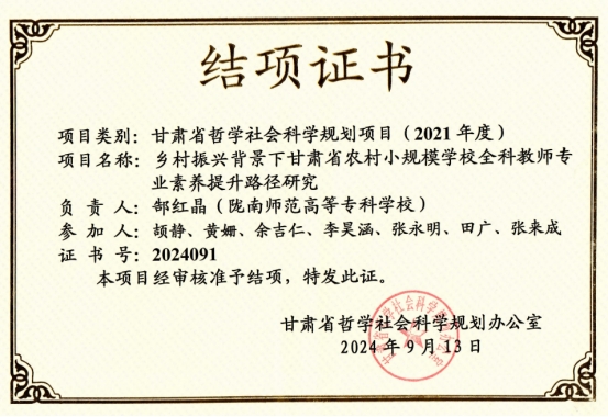 近日,米兰官网初等教育学院青年教师郜红晶主持的甘肃省哲学社会科学规划青年项目《乡村振兴背景下甘肃省乡村小规模学校全科教师专业素养提升路径研究》(批准号:2021QN039)通过甘肃省社会科学规划办公室审核,予以结项(证书号:2024091)。