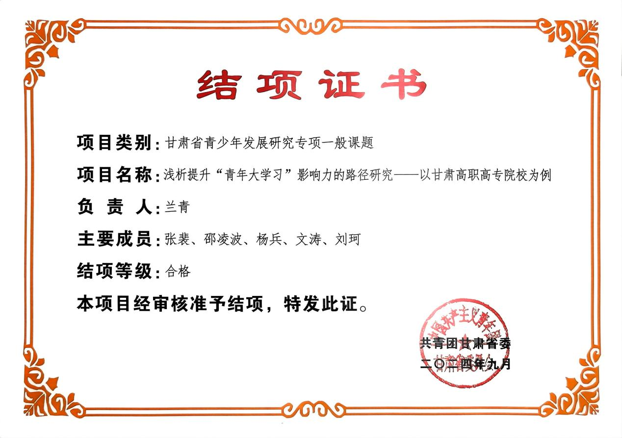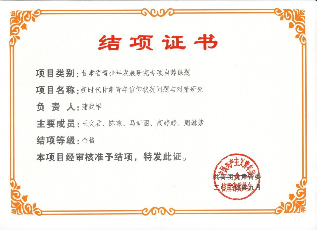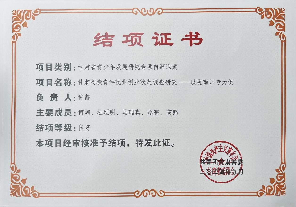 近日,共青团甘肃省委核发共青团青少年发展研究专项课题结项证书,米兰官网兰青主持申报的一般课题《浅析提升“青年大学习”影响力的路径研究——以甘肃高职高专院校为例》(项目编号GSQNZX-202103022),蒲武军主持申报自筹经费课题的《新时代甘肃青年信仰状况问题和对策研究》(项目编号GSQNZX-202104046)和许菡主持申报自筹经费课题的《甘肃省高校青年就业创业状况调查研究——以陇南师专为例》(项目编号GSQNZX-202104047)等3项课题通过验收结项。(团 委)