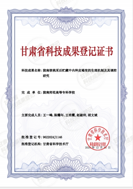 近日,米兰官网农林技术学院王一峰副教授主持的甘肃省自然科学基金项目“陇南核桃采后贮藏中内种皮褐变的生理机制及其调控研究(项目编号:22JR5RK1049)”顺利通过结题验收并完成成果登记。
