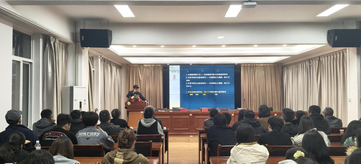 10月17日晚,ac米兰官网中文网站2025年下半年“学术活动月”系列活动精彩开讲。西北师范大学美术学院博士生导师蔡副全教授,应邀在电子商务学院3楼多功能厅作“从陇南金石到西北简牍——地域文化在高校艺术学科建设中的阐发”学术报告。活动由科研外事处与美术与设计学院联合主办。美术与设计学院院长宋涛主持,全校100余名师生到场聆听学习。