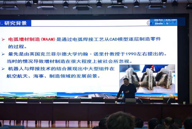 报告中,黄健康教授紧扣这两大核心目标,以钛合金增材制造为典型案例,清晰拆解了技术突破的完整逻辑体系,为在场师生呈现了一场兼具理论深度与实践价值的学术盛宴。在“控形”技术突破方面,黄教授重点阐释了机器人路径规划、视觉传感与闭环控制技术的协同应用机制。针对“控性”这一关键痛点,黄教授详解了双丝交叉电弧、粉末与气体原位强化等创新技术。团队通过优化双丝电弧参数,实现不同成分材料的精准熔合,同时在成型过程中通入强化气体并加入纳米粉末,使梯度功能钛合金的显微硬度提升35%,抗压强度和耐磨性分别提高28%和42%,成功实现材料“组织-结构-性能”的协同优化。这些技术成果已在航空航天零部件、高端医疗器件等领域初步应用,展现出广阔的产业化前景。
