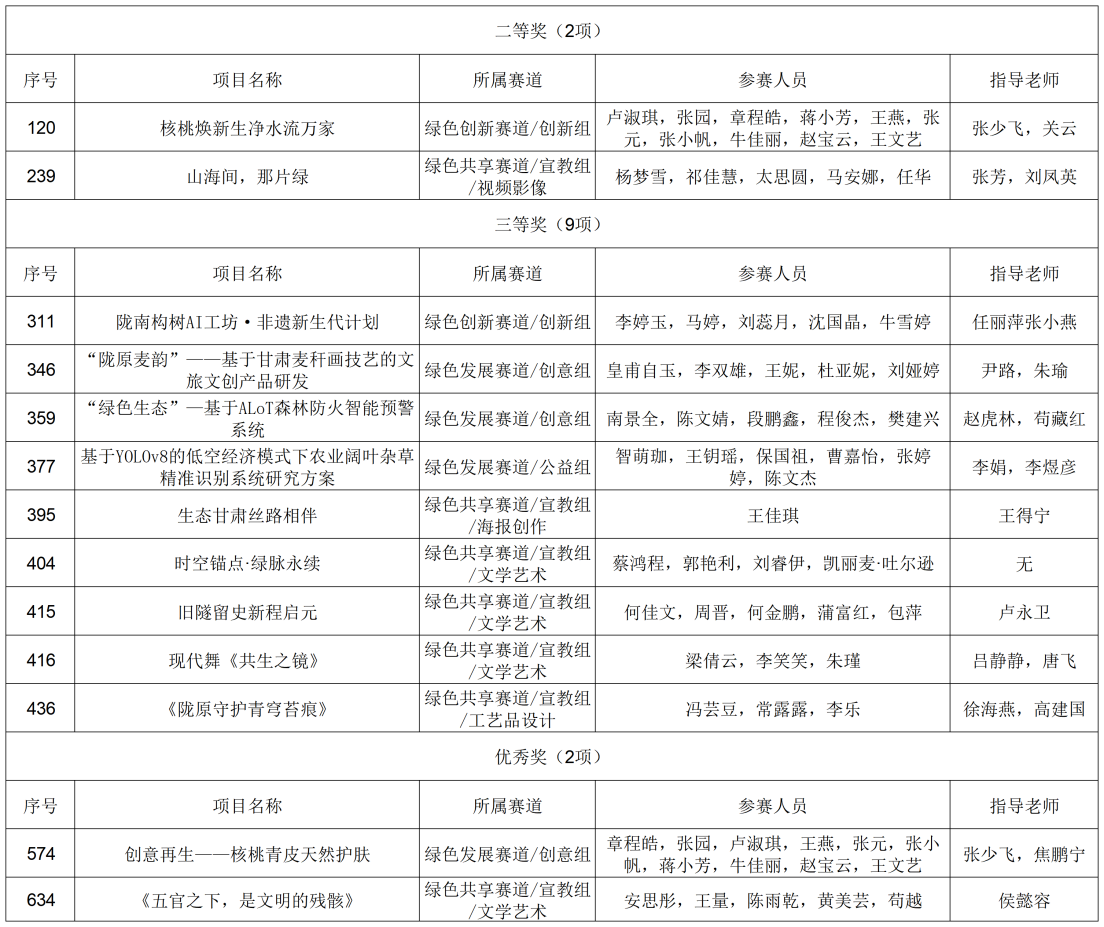3月23日,由共青团甘肃省委、省教育厅、省科技厅、省人力资源和社会保障厅、省自然资源厅、省生态环境厅、省水利厅、省农业农村厅、省林业和草原局、省青年联合会、省学生联合会等11个省级部门联合主办的第四届甘肃省青年生态文明创新创业大赛圆满落幕。米兰官网学子凭借扎实的专业素养和卓越的创新实践能力,共摘得13项奖,其中二等奖2项、三等奖9项、优秀奖2项,共计57名同学获奖。