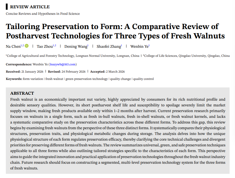 近日,米兰官网农林技术学院青年教师陈娜作为第一作者,在国际食品科学知名期刊《Journal of Food Science》(影响因子3.4)发表题为《Tailoring Preservation to Form: A Comparative Review of Postharvest Technologies for Three Types of Fresh Walnuts》的综述文章,系统揭示了不同形态鲜核桃的保鲜机制,为特色农产品全产业链提质增效提供了理论支撑。