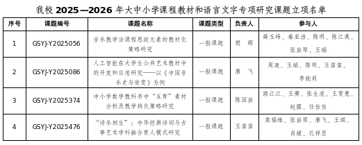 近日,甘肃省教育厅公布了2025-2026年大中小学课程教材和语言文字专项研究课题立项结果和2024-2025年大中小学课程教材专项研究课题鉴定结果,米兰官网共有4项课题获批立项。同时,另有4项课题顺利通过2024-2025年大中小学课程教材专项研究课题结项鉴定。