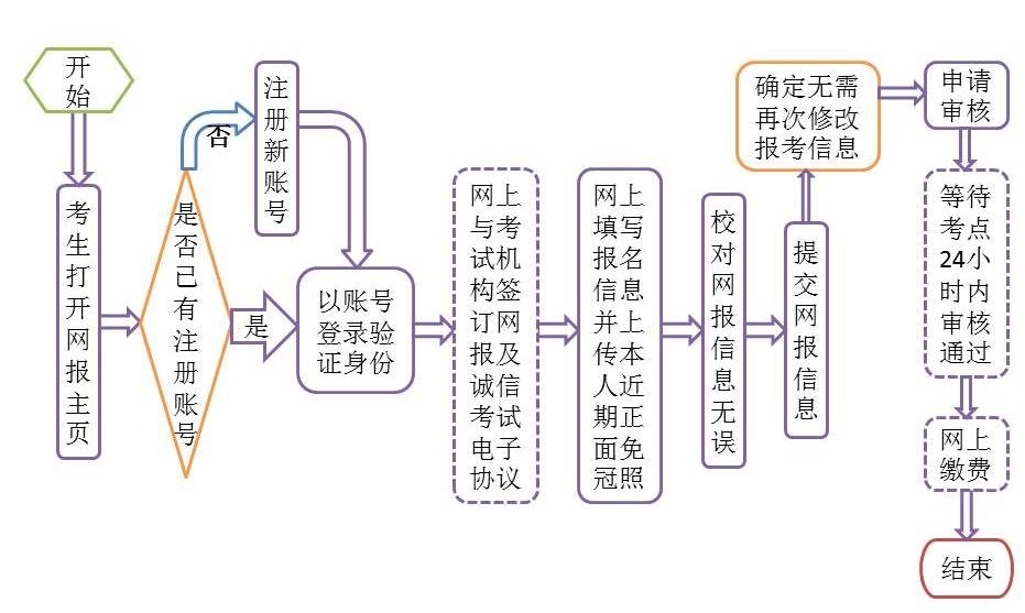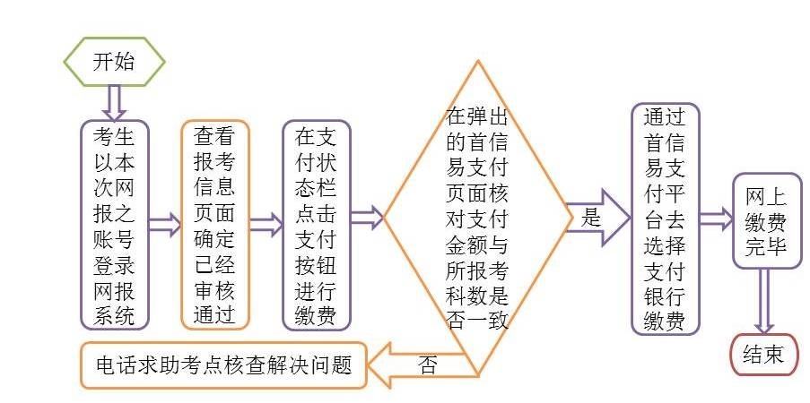 第二步:考生网上缴费。考生等待考点24小时之内审核通过后上网缴纳考试费即可。流程如下图: