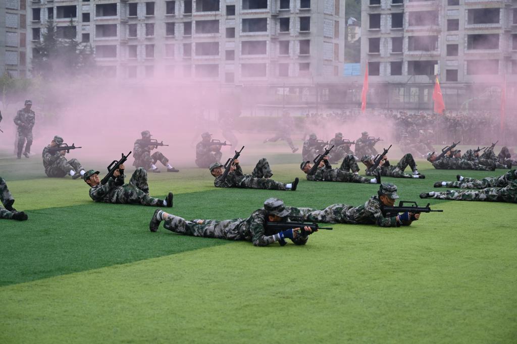 分列式军训会操表演结束后,文化队列、刺杀操、警棍盾牌操、女子匕首操、擒敌、战术和教官倒功操方阵轮番上场表演。嘹亮的喊声在操场上此起彼伏、久久回荡,每套动作都迅速有力,一招一式尽现陇师学子的豪迈气魄、展现了新一代陇南师专学子奋发昂扬的斗志和永不放弃的追求,现场高潮迭起,掌声雷动。
