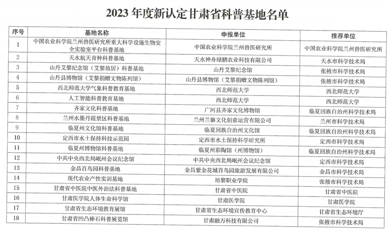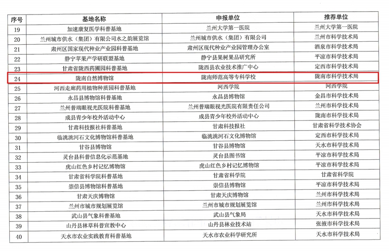 近日,甘肃省科技厅公布了“2023年度省级科普基地”认定名单,全省共40家单位被认定为甘肃省科普基地,米兰官网陇南自然博物馆成功入选。