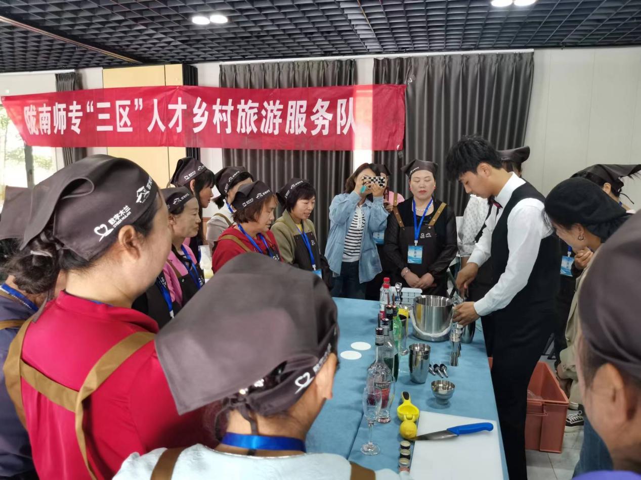 座谈会后,服务团开展了帮扶工作,就企业员工服务质量提升、新媒体营销、宣传推广、礼仪服务等方面开展了理论培训。培训过程中还对员工实操困难的中式铺床、酒水制作、餐厅服务技能等多方面开展了“手把手”帮扶培训。