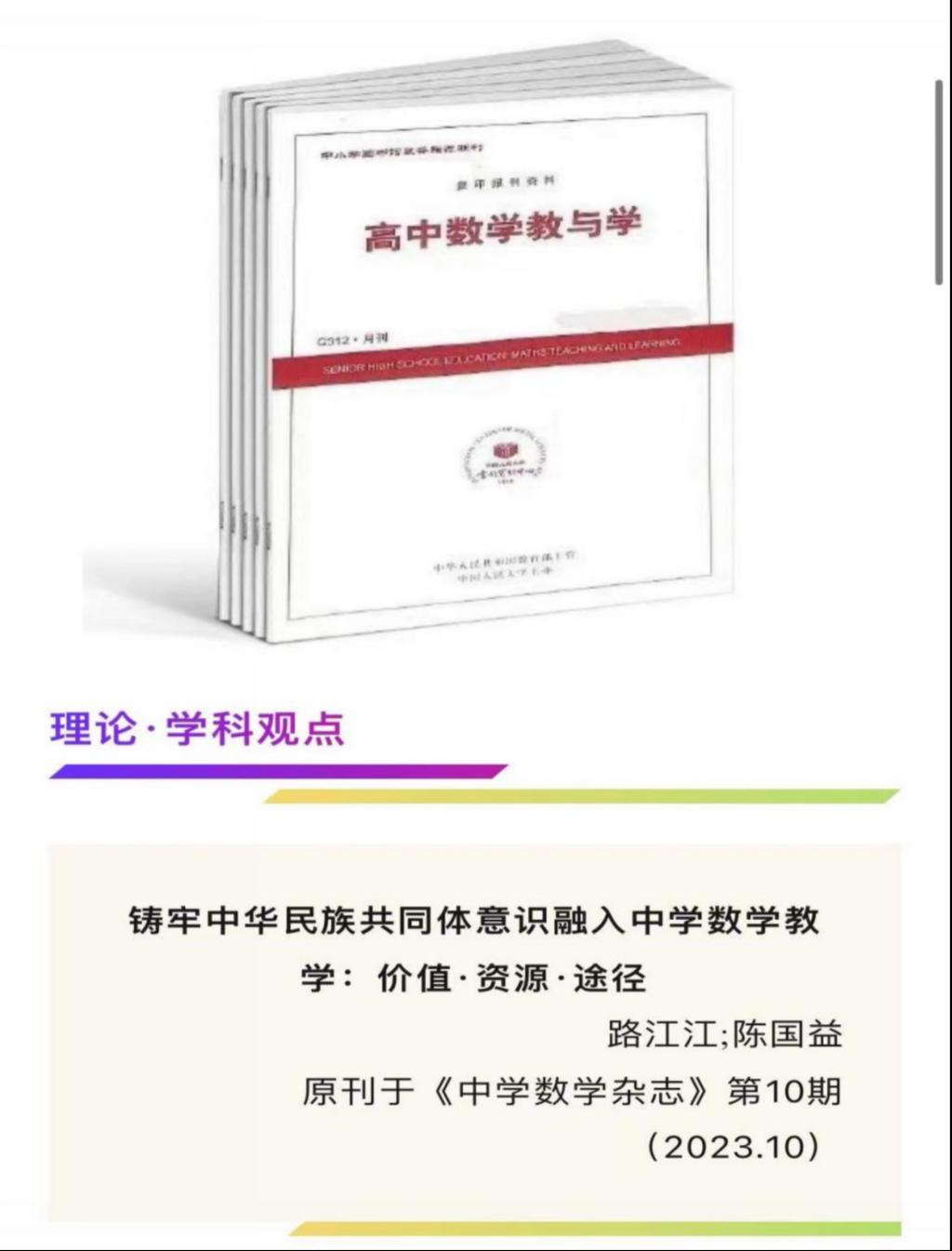 日前,米兰官网初等教育学院教师路江江、数信学院教师陈国益论文《铸牢中华民族共同体意识融入中学数学教学:价值·资源·路径》被中国人民大学书报资料中心(人大复印资料)《高中数学教与学》2024年第1期全文转载。该文原发表于《中学数学杂志》2023年第10期,全文约1万字。