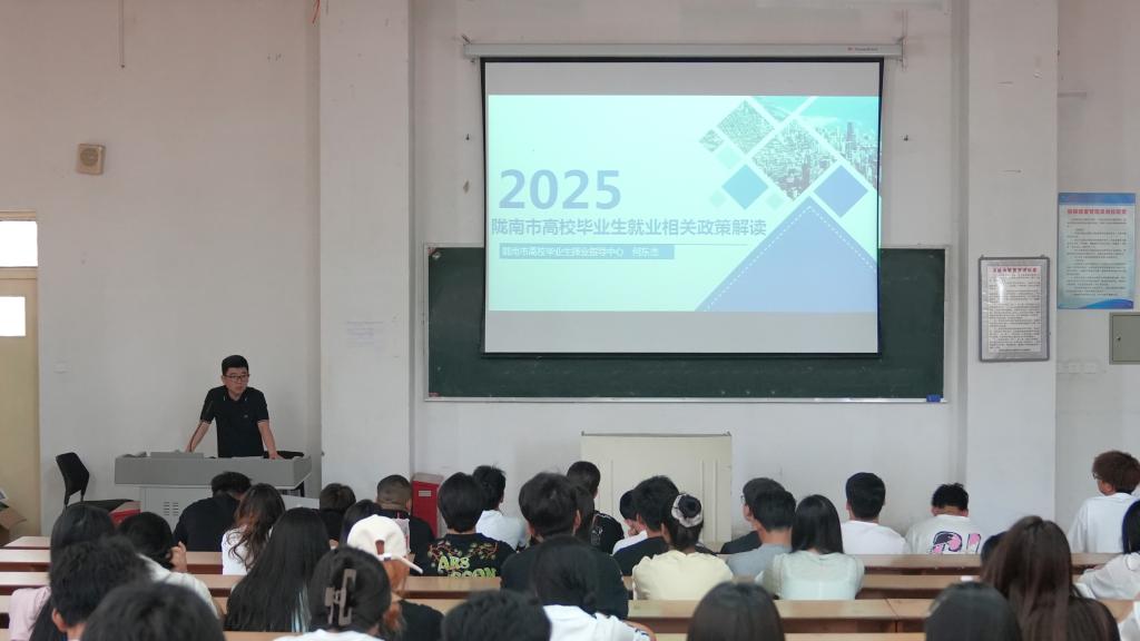 5月15日,米兰官网在育心楼116阶梯教室举办“公共就业服务进校园”就业政策宣讲会。陇南市人社局高校毕业生择业指导中心主任何东杰、城乡居民养老保险科副科长王丽为150余名2025届毕业生代表宣讲就业政策。招生就业处工作人员、二级学院辅导员参加此次活动。