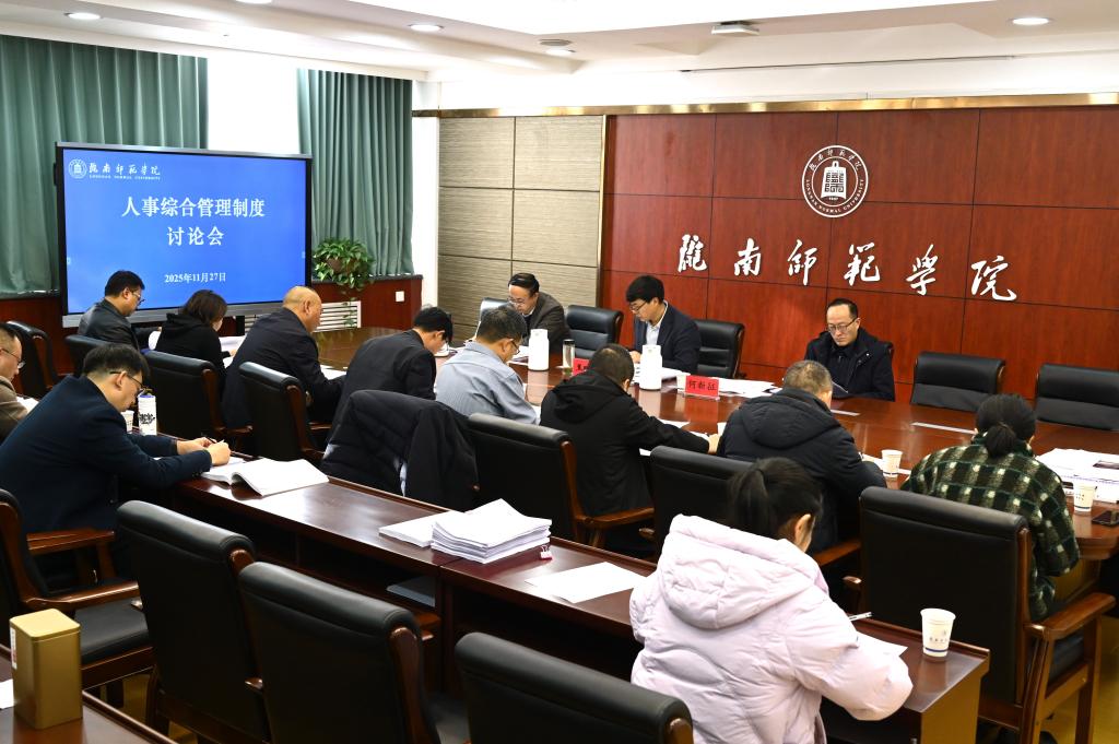 11月27日,学校召开人事综合管理制度修订专题讨论会。会议由党委副书记焦鹏宁主持。党委委员、副校长何新征,党委委员、组织部部长石明出席会议。