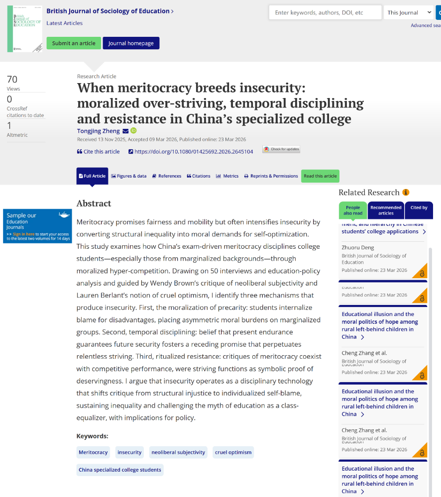 近日,米兰官网初等教育学院青年教师郑同京以独立作者身份,在国际知名教育社会学期刊British Journal of Sociology of Education发表研究性文章,题为When meritocracy breeds insecurity: moralized over-striving, temporal disciplining and resistance in China’s specialized college。该文通过考察优绩主义背景下中国专科生的现实处境,提出了一种分析不平等情感治理的新颖视角,进一步丰富和深化了学界对优绩主义的批评。